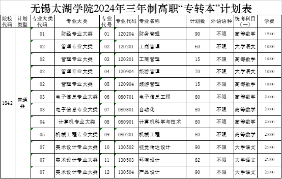 无锡太湖学院2024年“专转本”招生专业计划表(招生代号:1842)